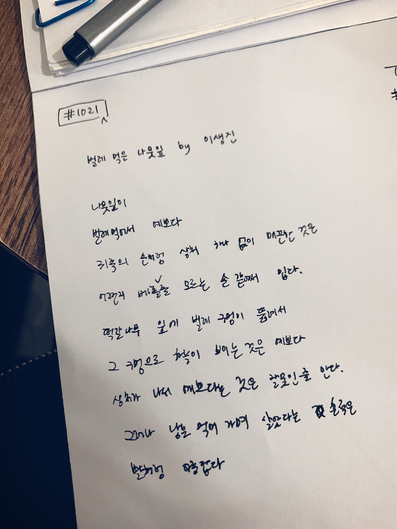 #프로젝트100 #1일1시 #손으로읽는시 #하루한편시필사 #벌레먹은나뭇잎 #이생진
