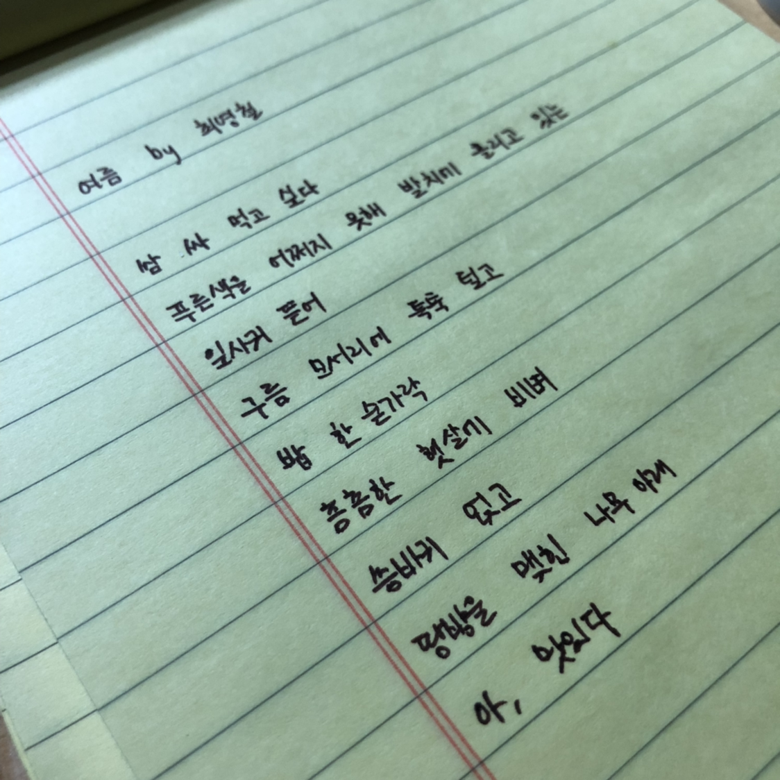 여름 by 최영철 쌈 싸 먹고 싶다 푸른색을 어쩌지 못해 발치에 흘리고 있는 잎사귀 뜯어 구름 모서리에 툭툭 털고 밥 한 숟가락 촘촘한 햇살에 비벼 씀바귀 얹고 땀방울 맺힌 나무 아래 아, 맛있다