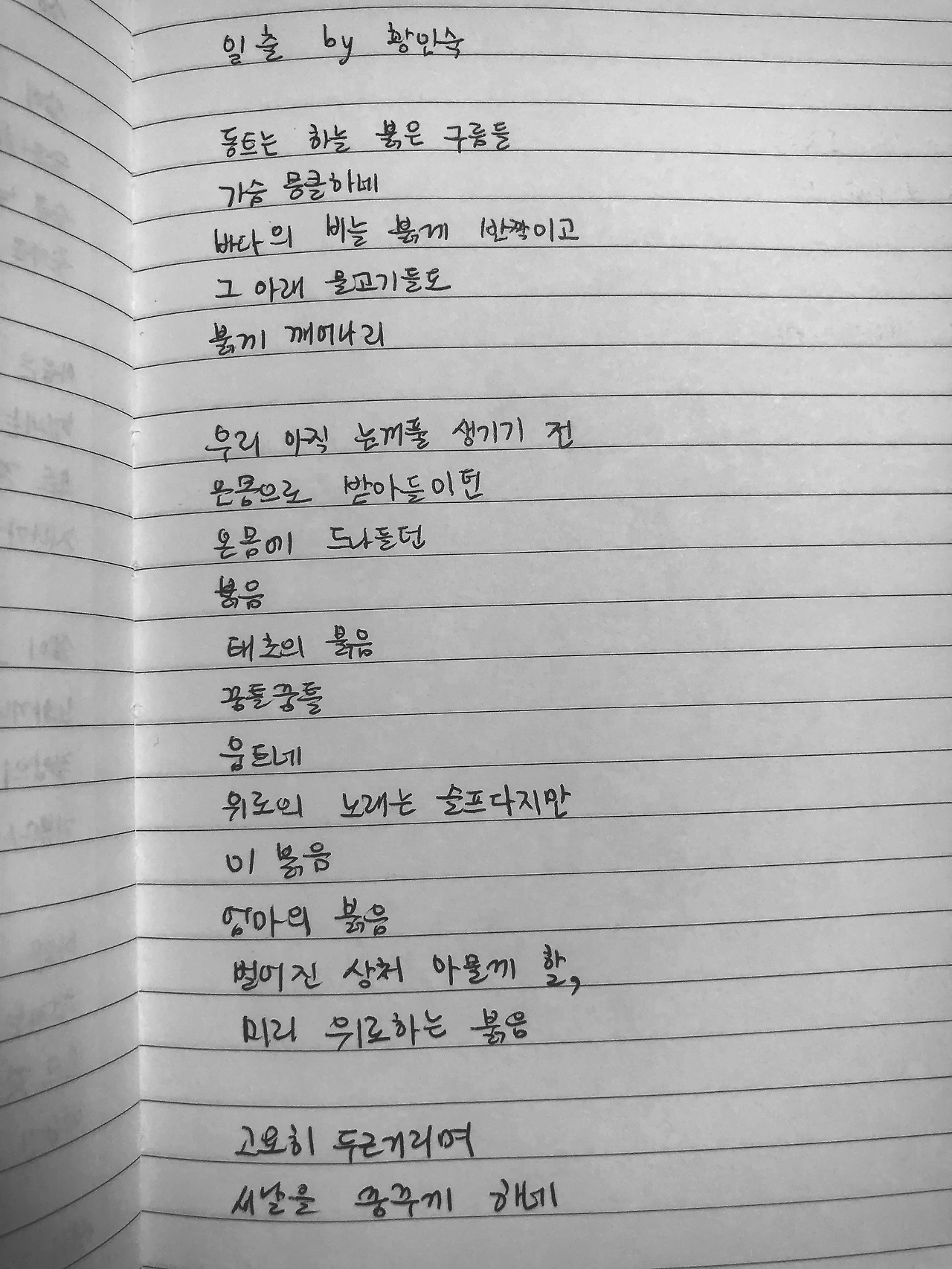일출 by 황인숙동트는 하늘 붉은 구름들가슴 뭉클하네바다의 비늘 붉게 반짝이고그 아래 물고기들도붉게 깨어나리우리 아직 눈꺼풀 생기기 전온몸으로 받아들이던온몸에 드나들던붉음태초의 붉음꿈틀꿈틀움트네위로의 노래는 슬프다지만이 붉음엄마의 붉음벌어진 상처 아물게 할,미리 위로하는 붉음고요히 두근거리며새날을 꿈꾸게 하네