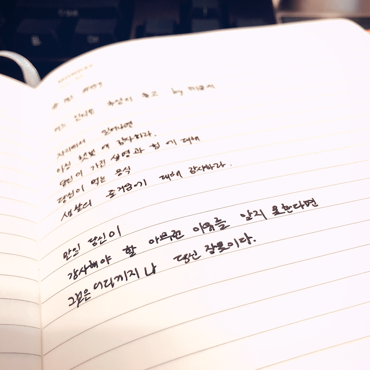 어느 인디언 추장의 충고 by 테쿰세자리에서 일어나면아침 햇빛에 감사하라.당신이 가진 생명과 힘에 대해당신이 먹는 음식생활의 즐거움에 대해 감사하라.만일 당신이감사해야 할 아무런 이유를 알지 못한다면그것은 어디까지나 당신 잘못이다.