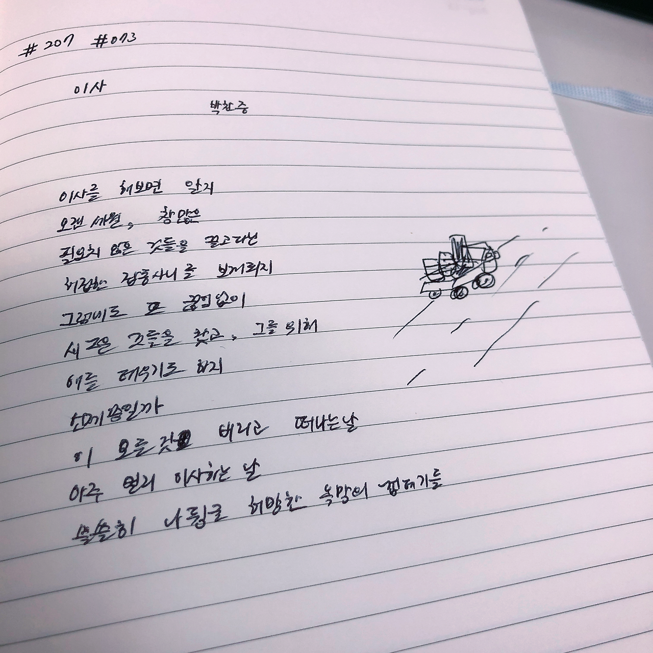 이사 by 박찬중이사를 해보면 알지 오랜 세월, 참 많은 필요치 않은 것들을 끌고다닌 허접한 잡동사니를 보게 되지 그럼에도 또 끊임없이 새로운 것들을 찾고, 그를 위해 애를 태우기도 하지 언제쯤일까 이 모든 것 버리고 떠나는 날 아주 멀리 이사하는 날 쓸쓸히 나뒹굴 허망한 욕망의 껍데기들