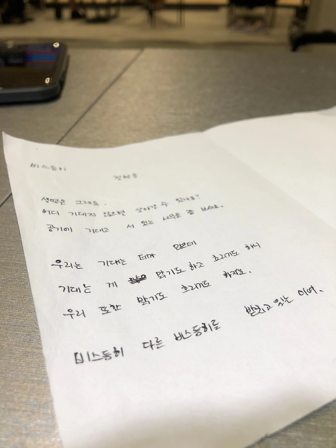 비스듬히 by 정현종생명은 그래요.어디 기대지 않으면 살아갈 수 있나요?공기에 기대고 서 있는 나무들 좀 보세요.우리는 기대는 데가 많은데기대는 게 맑기도 하고 흐리기도 하니우리 또한 맑기도 흐리기도 하지요.비스듬히 다른 비스듬히를 받치고 있는 이여.
