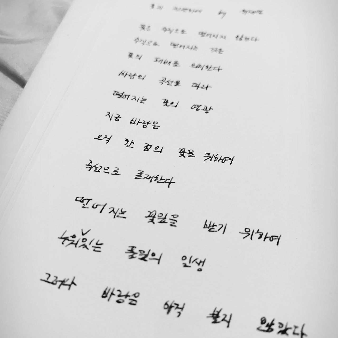 꽃과 관련하여 by 유재영꽃은 수직으로 떨어지지 않는다수직으로 떨어지는 것은꽃의 패배를 의미한다바람의 곡선을 따라떨어지는 꽃의 영광지금 바람은오직 한 점의 꽃을 위하여곡선으로 존재한다떨어지는 꽃잎을 받기 위하여누워 있는 풀잎의 일생그러나 바람은 아직 불지 않았다