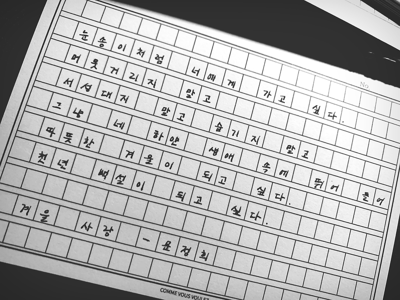 겨울 사랑 by 문정희눈송이처럼 너에게 가고 싶다. 머뭇거리지 말고 서성대지 말고 숨기지 말고 그냥 네 하얀 생애 속에 뛰어 들어 따스한 겨울이 되고 싶다. 천년 백설이 되고 싶다.