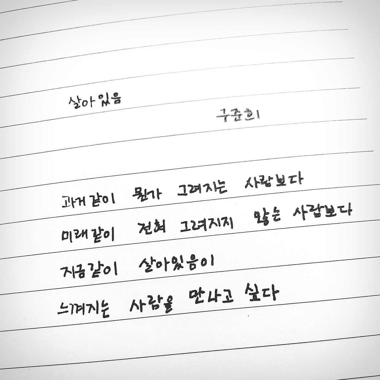 살아있음 by 구준회과거같이 뭔가 그려지는 사람보다미래같이 전혀 그려지지 않는 사람보다지금같이 살아있음이느껴지는 사람을 만나고 싶다