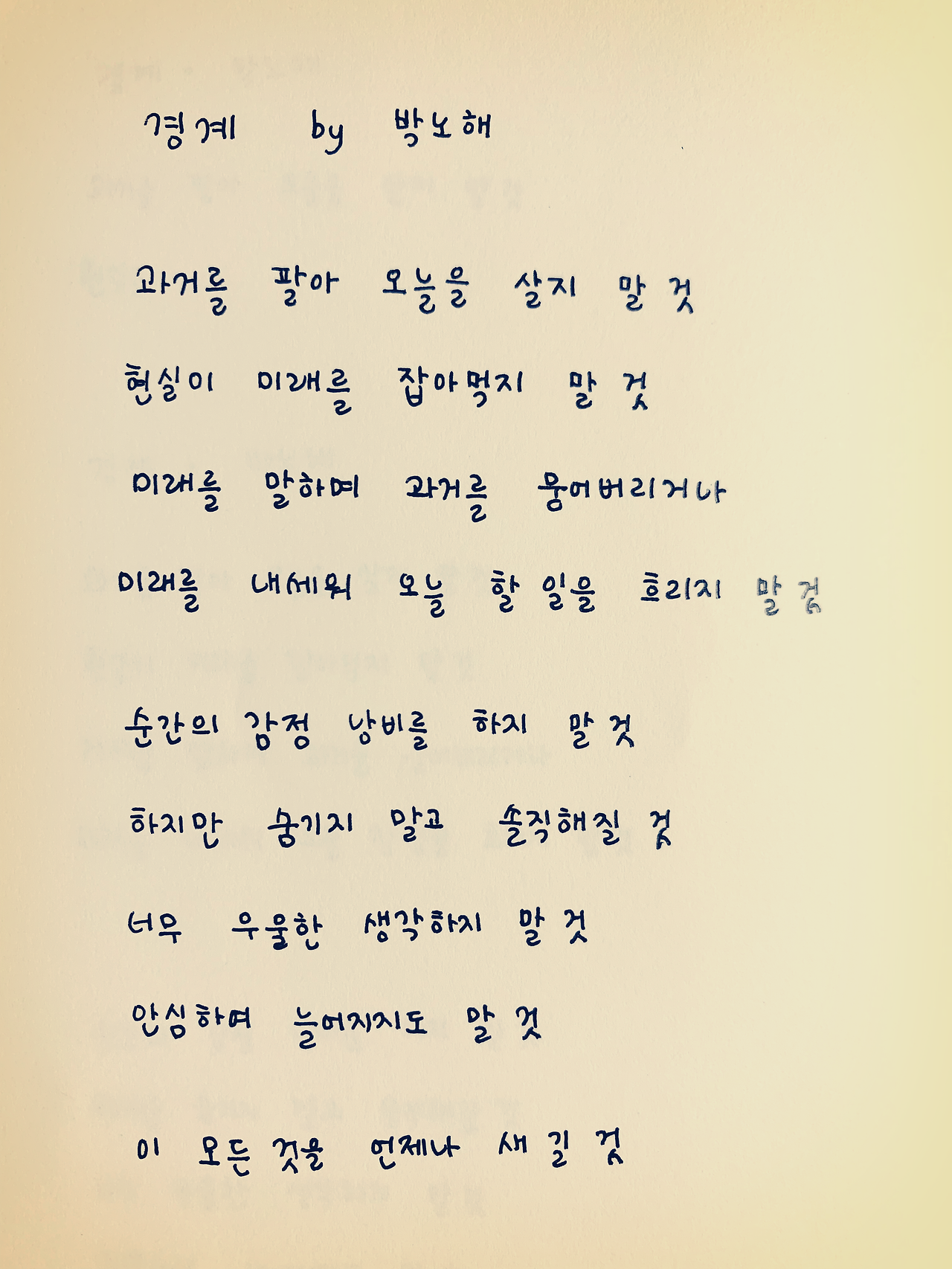 경계 by 박노해 과거를 팔아 오늘을 살지 말 것 현실이 미래를 잡아먹지 말 것미래를 말하며 과거를 묻어버리거나미래를 내세워 오늘 할 일을 흐리지 말 것 순간의 감정 낭비를 하지 말 것하지만 숨기지 말고 솔직해질 것너무 우울한 생각하지 말 것안심하여 늘어지지도 말 것 이 모든 것을 언제나 새길 것