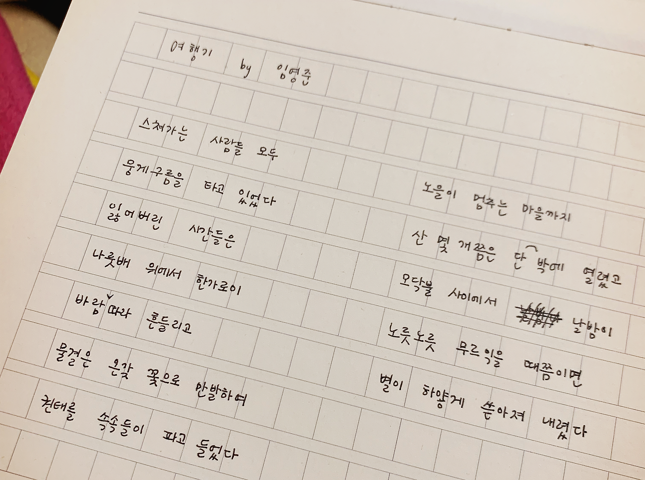 여행기 by 임영준 스쳐가는 사람들 모두뭉게구름을 타고 있었다잃어버린 시간들은나룻배 위에서 한가로이바람 따라 흔들리고물결은 온갖 꽃으로 만발하여권태를 속속들이 파고 들었다노을이 멈추는 마을까지산 몇 개쯤은 단박에 열렸고모닥불 사이에서 날밤이노릇노릇 무르익을 때쯤이면별이 하얗게 쏟아져 내렸다