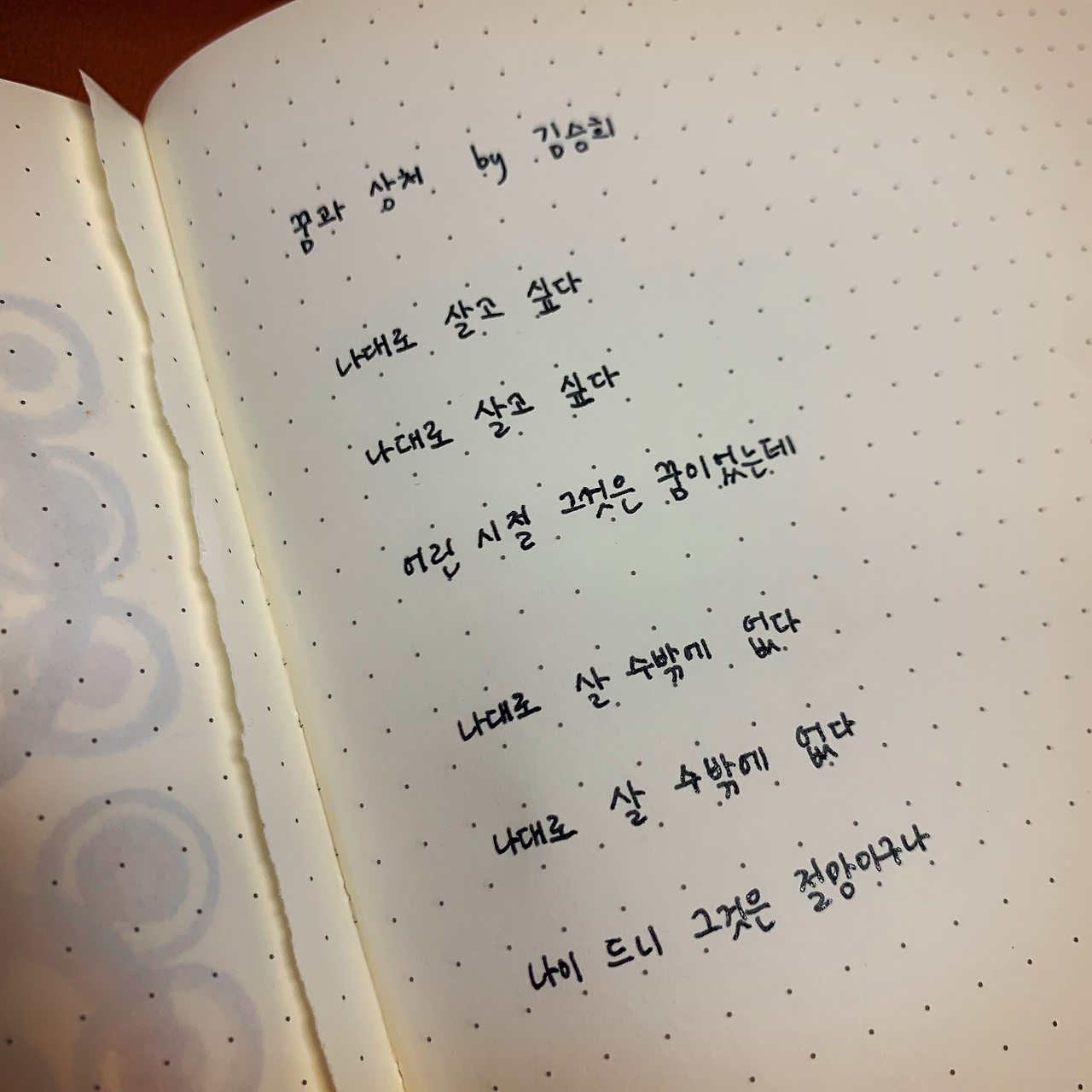 꿈과 상처 by 김승희나대로 살고 싶다나대로 살고 싶다어린 시절 그것은 꿈이었는데나대로 살 수밖에 없다나대로 살 수밖에 없다나이 드니 그것은 절망이구나
