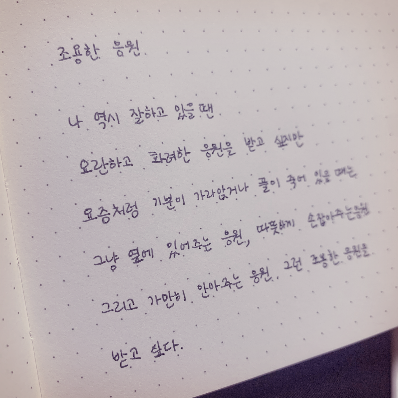 조용한 응원 by 한비야나 역시 잘하고 있을 땐 요란하고 화려한 응원을 받고 싶지만 요즘처럼 기분이 가라앉거나 풀이 죽어 있을 때는그냥 옆에 있어주는 응원, 따뜻하게 손잡아주는 응원 그리고 가만히 안아주는 응원, 그런 조용한 응원을 받고 싶다.