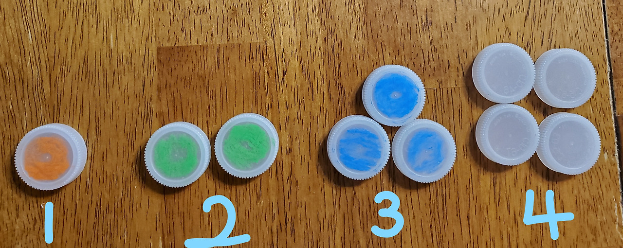 병뚜껑에 크레용으로 색칠을 해 각 색깔에 뜻을 정해 주었다. 지퍼락 백을 이용해 10개가 되면 지퍼백에 집어넣고 다른 색깔 병뚜껑으로 교환해 주며 자릿수의 개념을 정리했다.