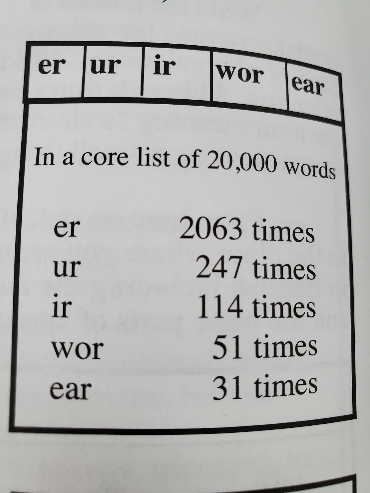 Margaret Bishop은 "In The ABC's and All Their Tricks"에서 영어를 배우기 시작할 때 쓰이는 2만 단어를 분석했는데 /얼/소리의 90%는 er로 스펠링 되는 것을 알아냈다. 두 번째로 많이 쓰이는 ur은 er의 10분의 1, 다음으로 많이 쓰이는 ir은 ur의 반, wor의 빈도는 ir의 반 이런 식의 페턴을 보이는 것을 알아냈다.