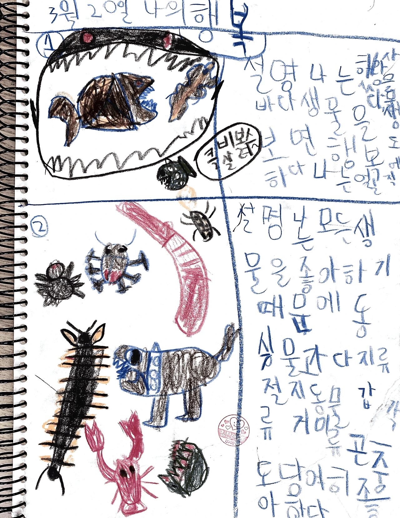 돌아온 하하에게 재밌었냐고 물어보니 좋았다고 한다. 첫시간에는 자기소개를 하면서 모두가 자기의 자연명을 짓고 그 이름으로 부르기로 한 모양이다. 하하는 헤라클레스왕장수풍뎅이를 자기 자연명으로 지었다고 한다. 그럴줄 알았다. 하하가 가장 좋아하는 곤충이다. 이름을 부를때마다 얼마나 길고 번거로울 것이냐. 그냥 풍뎅이도 아니고 장수풍뎅이도 아니고 왕장수풍뎅이만도 아니고 헤라클레스왕장수풍뎅이라니.