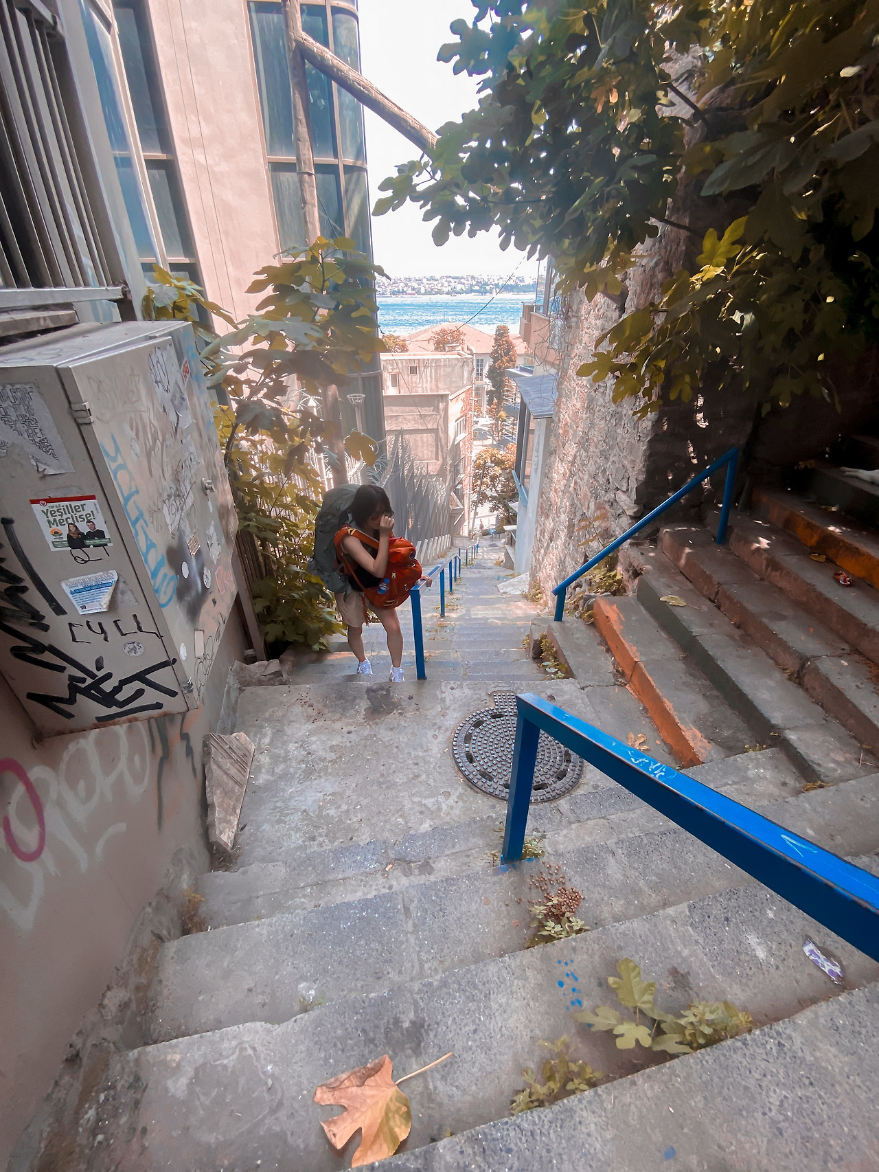 우리는 신시가지에서 이틀을 묵으며 아시아지구까지 구경하며 유럽과 아시아를 하루에 넘나들고, 구시가지로 숙소를 옮겼다. 이번엔 3만 원대 에어비앤비. 슐탄아흐멧에서 구시가지 숙소까지는 트램을 타고 여섯 정거장, 내려서 12분 정도 걸으면 되는 거리였다. 35도 땡볕이라고 해도. 12분쯤이야. 그런데 그 길이 오르막일 줄이야. 아이의 손을 꼭 잡고 신호등 없는 찻길을 조심조심 건너 몇 발자국을 걷자마자 코너를 돌아 눈앞에 드러낸 긴 계단 앞에서 머리가 핑 도는 것 같았다.
