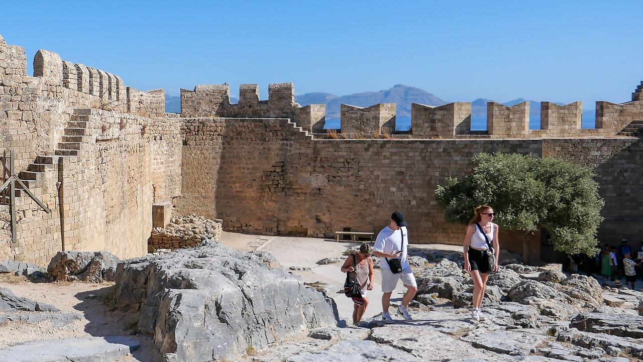 린도스에도 아크로폴리스가 있고 거기에 아테나 신전이 있다. 가장 높은 곳에 세워진 아크로폴리스와 아래 주거공간으로 이루어진 전형적인 그리스 고대 도시의 모습이다. 아테네 아크로폴리스가 이번 여행 일정에 포함되어 있긴 하지만, 린도스 아크로폴리스도 방문했다. 어른 12유로 어린이 6유로. 아크로폴리스에 오르면 독특한 양식의 마을 전체를 조망할 수 있고 린도스 비치도 보인다. 그리고 김홍정 작가 소설의 상징적 소재인 올리브나무가 있다.