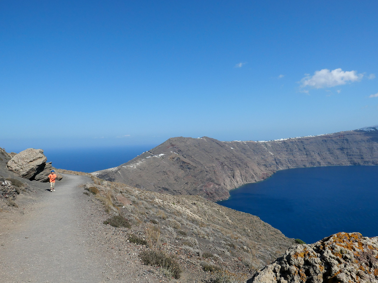 중간에 하하가 화장실이 급하다고 하여 아무 카페나 가서 일단 화장실부터 보내고 메뉴판을 보는데 먹을만한 게 없어 그냥 일어서려고 했더니 화장실값 2유로 내라고. 그래서 가장 싼 레몬수를 3유로에 사들고 나왔다. 그리스 최고 휴양지의 인심이니 그럴 만도 하다. 어느 정도 걷다 보면 음식점들도 줄어 띄엄띄엄 있고, 그마저도 끊기는 구간이 나온다. 앞뒤로 길게 섬의 꼬리가 보이며, 화산섬이라 흙은 검고, 양옆은 푸르러 바다와 하늘과 맞닿아 있고, 거기에다가 오가는 사람도 거의 없으니, 이 세상의 길을 걷는 것 같지가 않았다. 신혼여행지로 휴양의 섬으로만 유명했던 산토리니의 재발견이다.