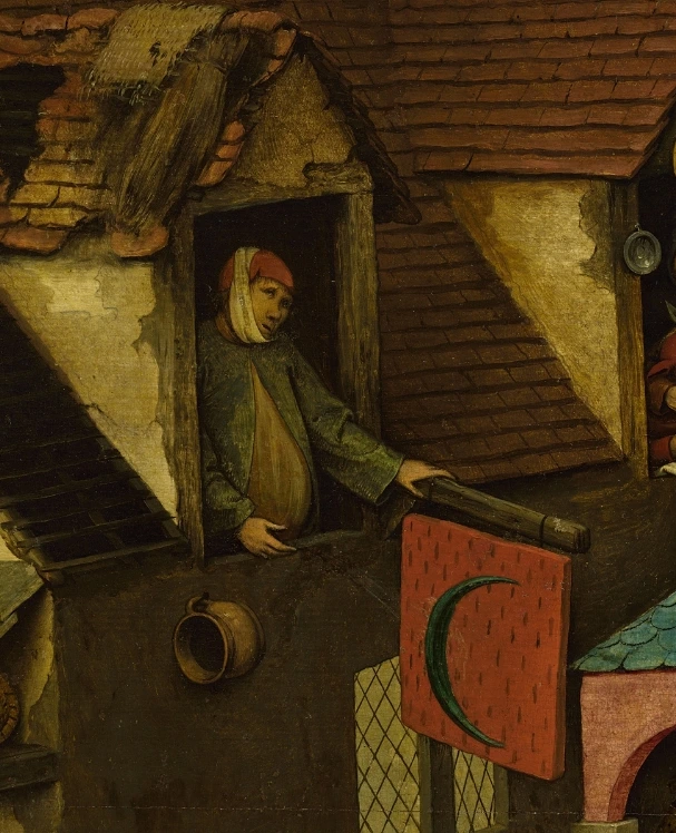 16세기 화가 피터 브뤼겔의 「네덜란드 속담」 속 한 장면에는 선뜻 이해하기 어려운 남자가 등장한다. 그는 달이 그려진 간판대를 붙잡고, 달을 향해 오줌을 누고 있다. 자세는 위태롭고, 시선은 지나치게 높다.