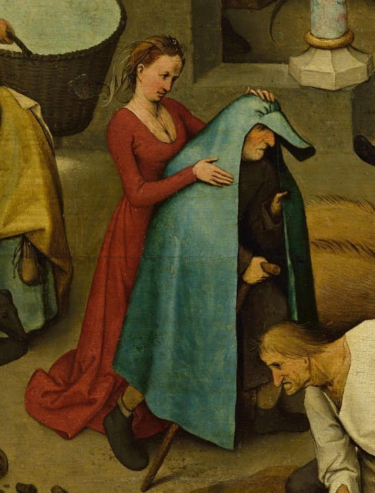 피터 브뤼겔의「네덜란드 속담」에는 이런 인간의 태도를 정면으로 포착한 장면이 있다. 붉은 옷을 입은 여인은 안정된 자세로 푸른 망토를 남자의 몸을 감싼다.