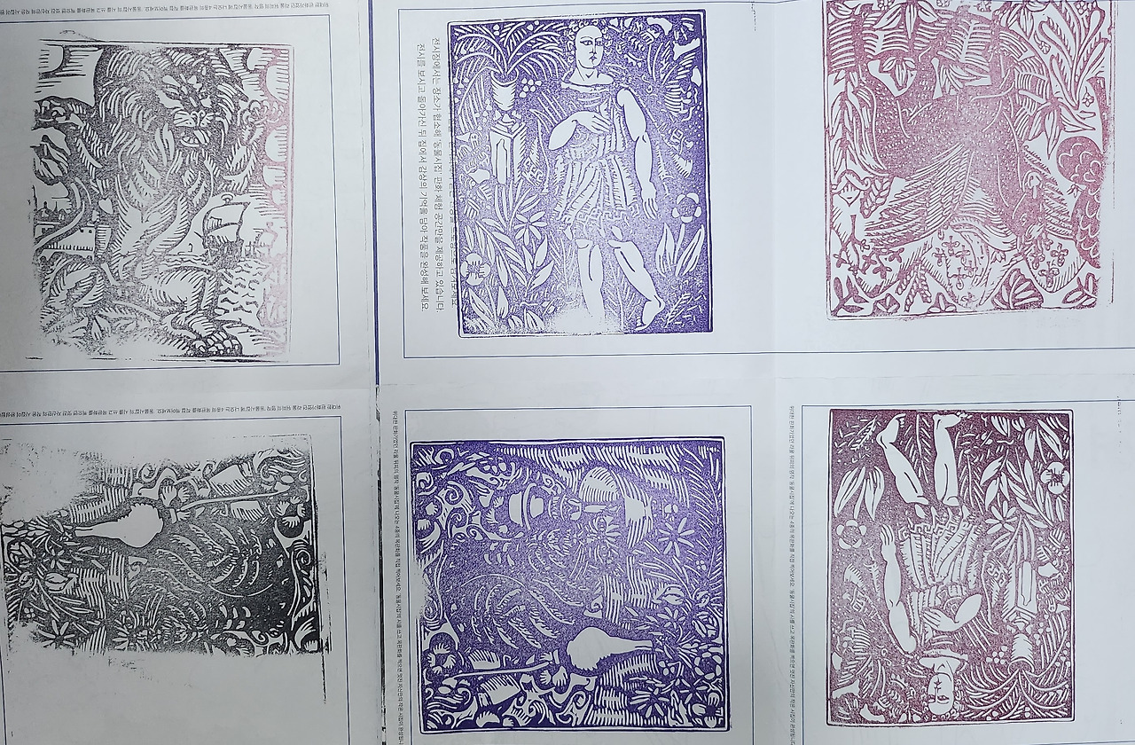 라울 뒤피는 종이에도 아름다운 그림을 그렸지만 다른 방식으로도 그림을 만들어냈단다. 이건 판화라고 하는 거야. <동물시집>이라는 책에 그림을 넣기 위해서 나무에 그림을 그린 후에 조각처럼 파내는 작업을 한 다음에 잉크나 물감을 묻혀서 종이에 찍어내는 거지. 저기 가서 우리도 한 번 찍어볼까?