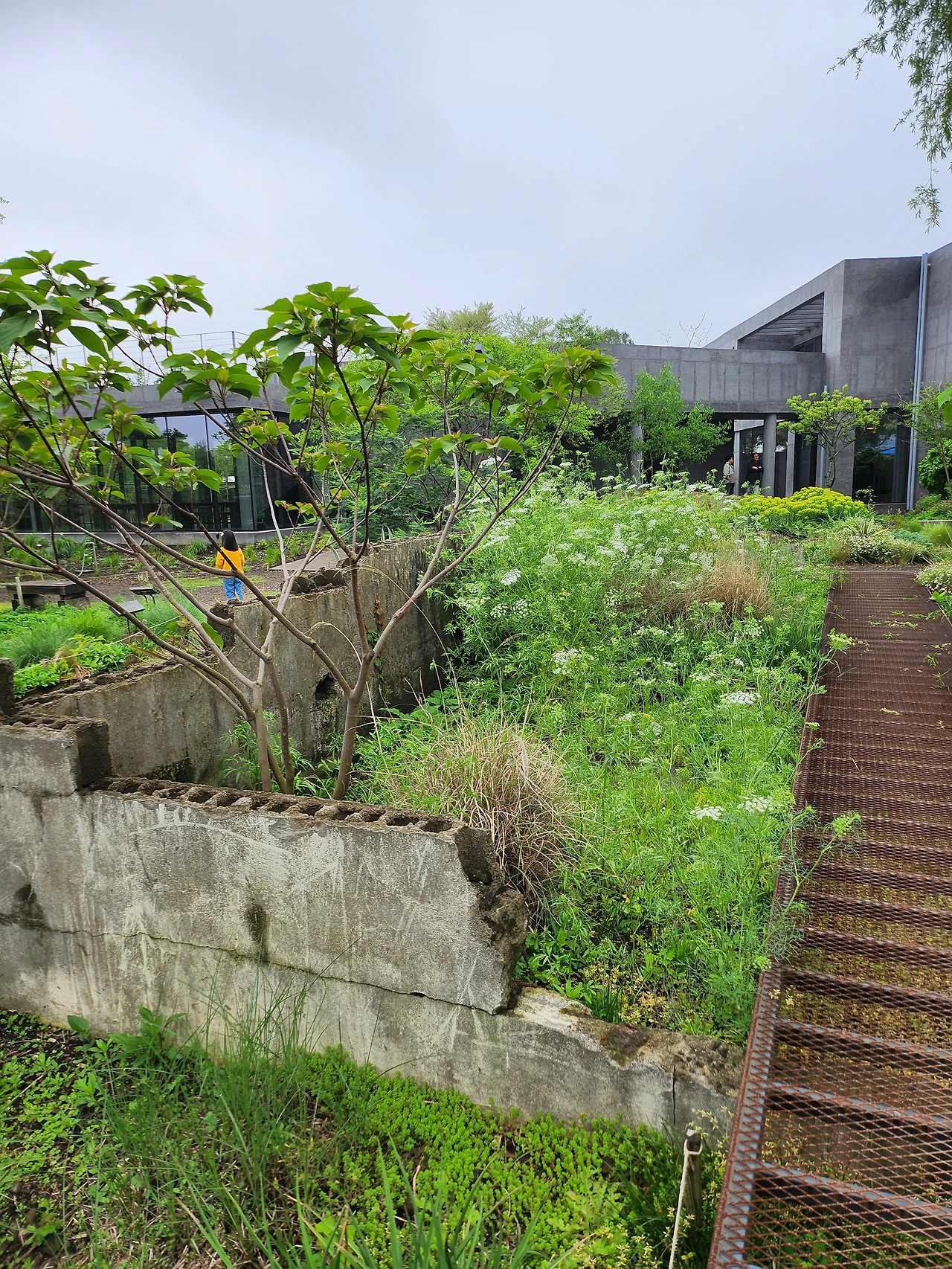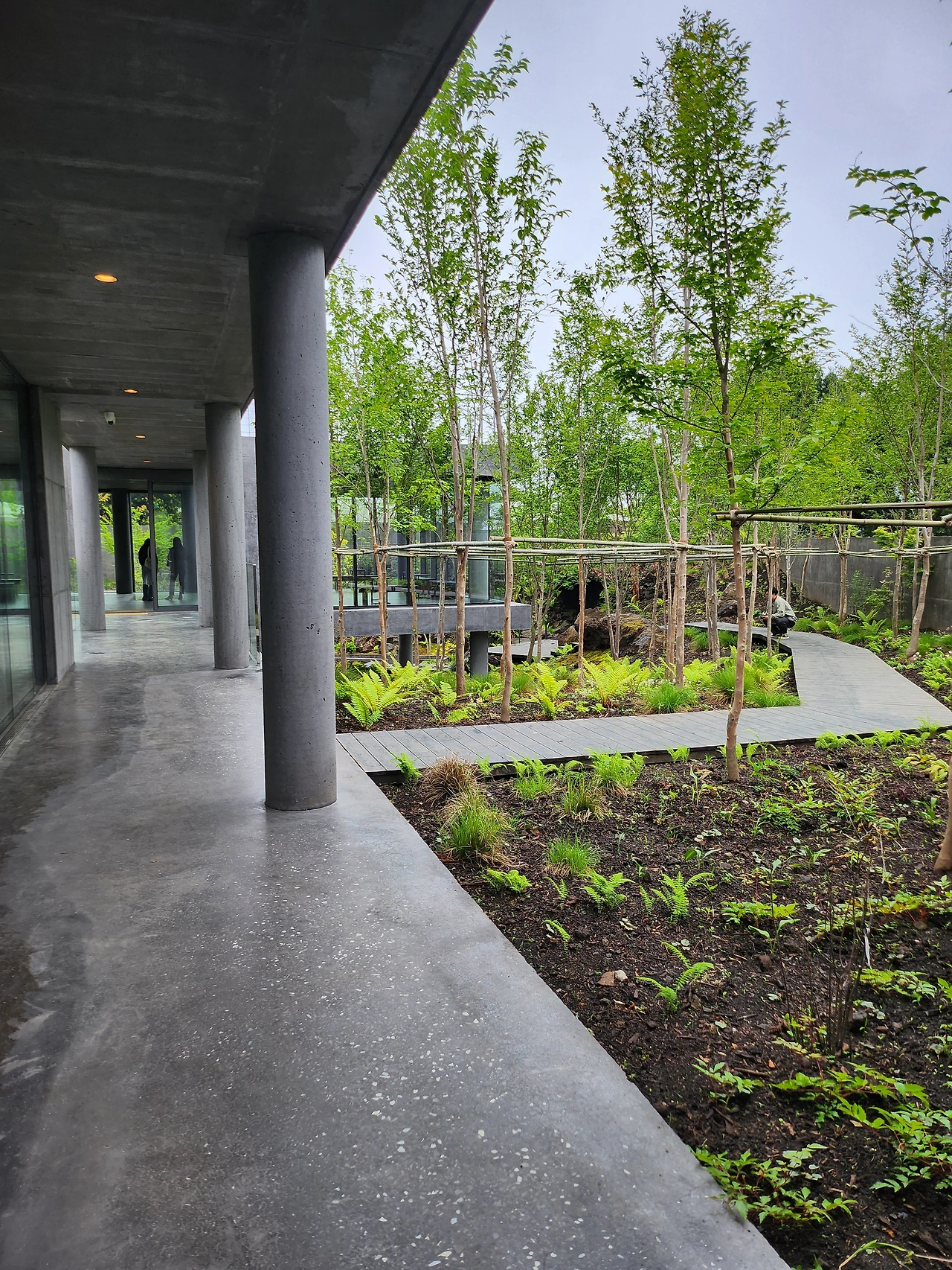 콘크리트 외관은 건축가들이 생각하는 덧대지 않은 가장 자연스러운 모습이라 한다. 도슨트가 되어 설명하는 건축가의 말을 들어보니 화려한 멋을 내지 않은 골조가 자연의 일부 같다는 생각이 든다. 마감재는 떨어지는 빗방울, 계절에 따라 색과 모습이 변하는 자연이다. 외관의 어두움은 자연과 대비되어 나의 시선을 자연으로 돌리게 만든다. 건물은 자연의 색, 모습, 향기의 배경이 되는 것과 동시에 자연의 흐름을 따라간다. 마치 생명을 부여받은 것처럼.