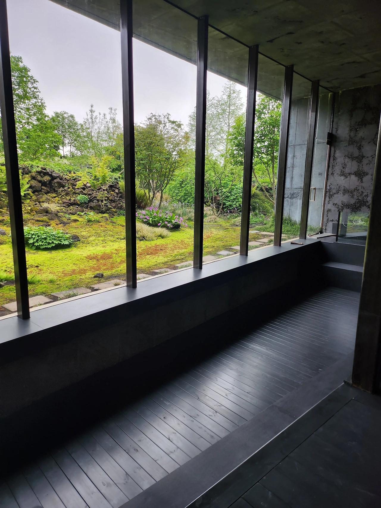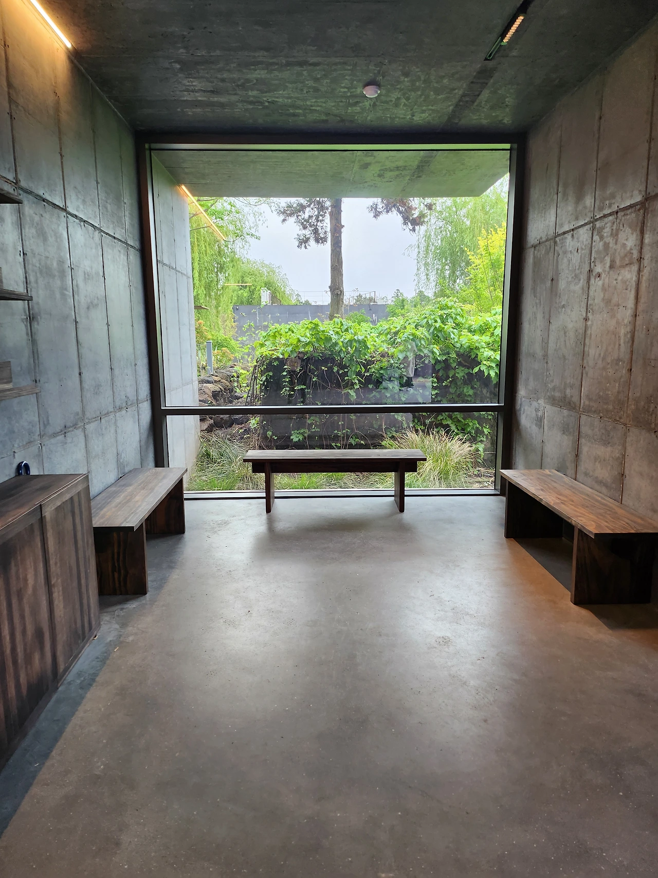 정원의 가장 끝에 있는 건물, 그곳에 들어가 본다. 깊고 낮게 설계된 내부는 어스름하다. 앉아서 창 밖을 올려다보면 앉아 있는 공간과 대비되는 자연의 푸르름과 조금은 어둑한 햇빛이 장마철 잠시 드러낸 해처럼 안온한 느낌을 준다.