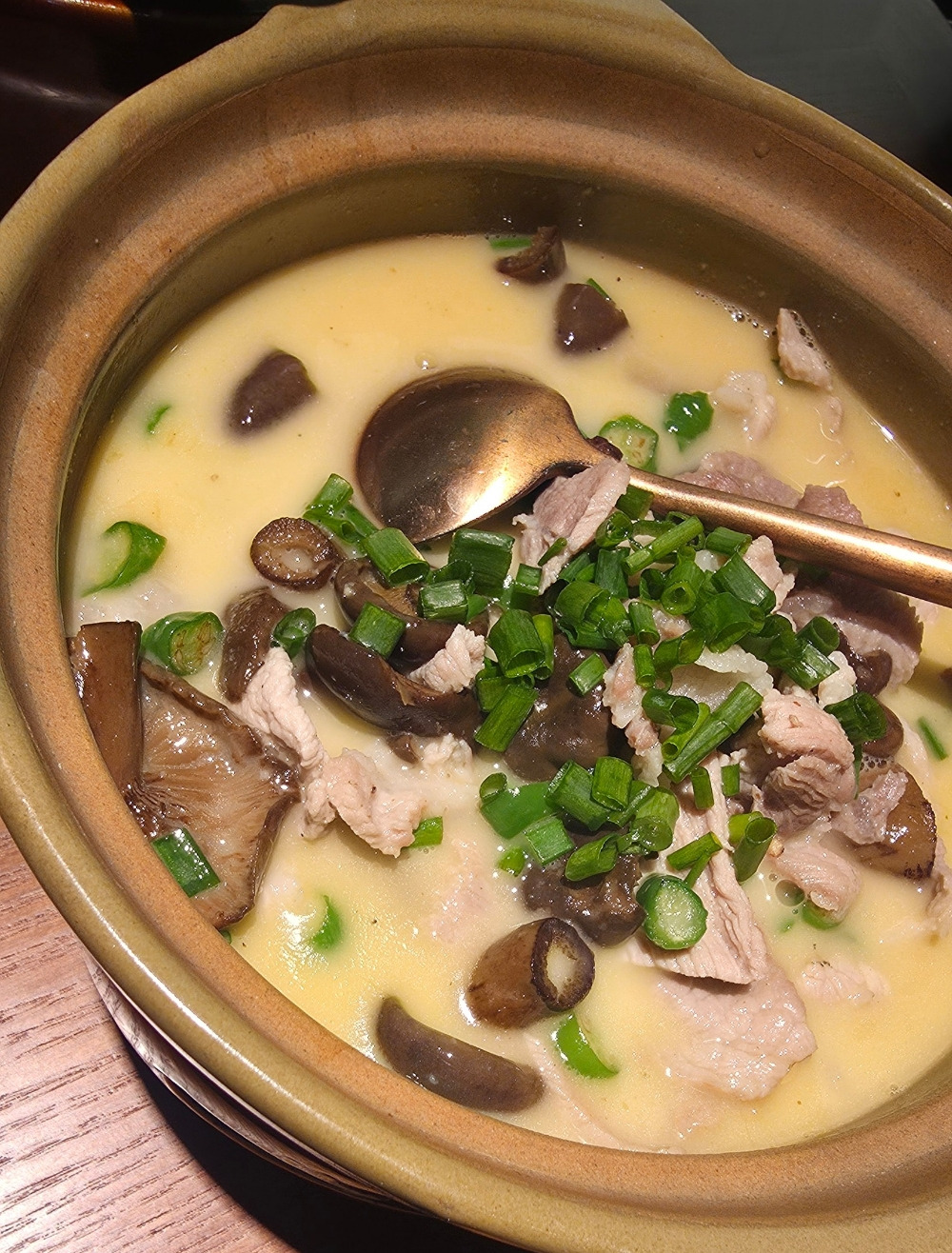 중국인 엄마들의 추천대로 시킨 음식은 아래 사진과 같이 돼지고기와 버섯이 들어간 국물요리, Mashed eggplant&Chili with Century Egg,