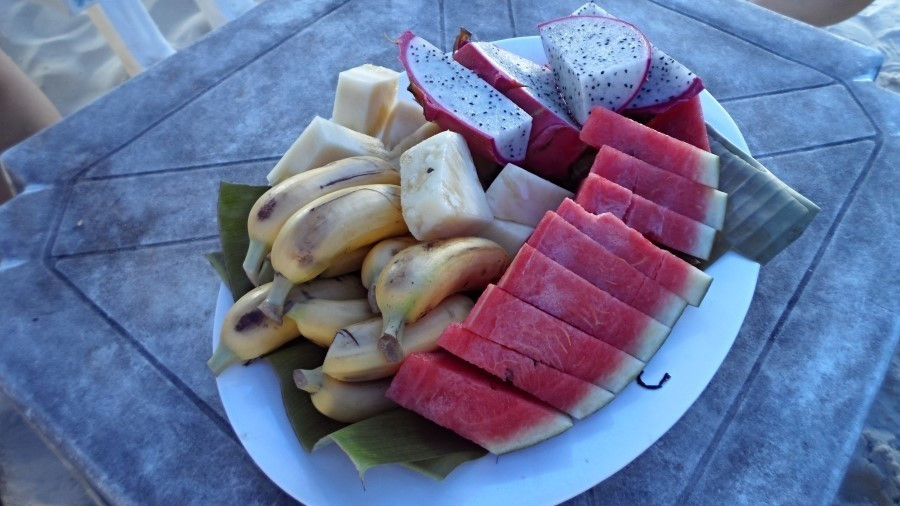 이제쯤 신혼부부가 돌아왔을까 싶어, 선착장 그늘에서 걸어 나와 다시 파라솔 쪽으로 와보니, 큰 접시에 몽키 바나나와 파인애플, 수박, 용과를 담아 큰 플라스틱 바구니로 덮어 놓여 있다. 난 몽키 바나나를 하나 까먹고 조금 있다 또 하나 까먹고 하다가 거의 한 송이를 다 먹었다. 나는 몽키 바나나가 맛이 있는데 이곳 사람들은 그것은 원숭이들이나 먹는거 라며 먹지 않는단다. 그러면서 우리에게는 왜 파는 거지?