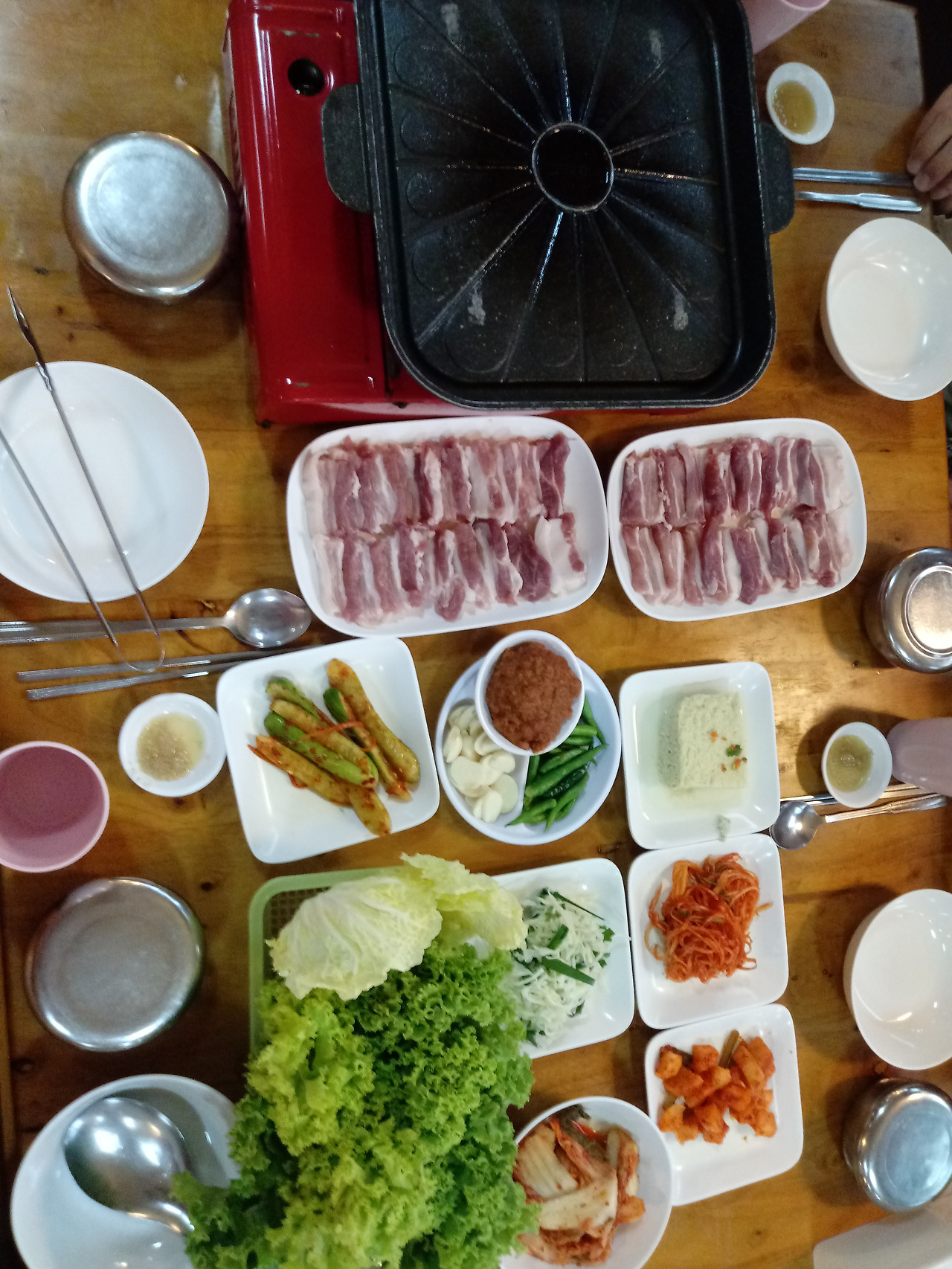 우리가 호텔에서 방콕하는 사이, 신혼부부는 크루즈에서 저녁먹으며 방콕 야경을 즐긴후 태국 전통쇼를 보고 올거라며 우리 끼리 저녁 먹으란다. 저녁 때가 되자, 태국 가이드가 우리 둘을 식당에 데려다 주었다. 저녁 메뉴는 삼겹살이다. 완전 생 오겹살이다. 또 맛있다. 배부르다. 미치겠다. 푸짐하고 맛있는 밥을 빠짐없이 챙겨 먹고 호텔 근처의 타이 마사지 샵을 갔다.