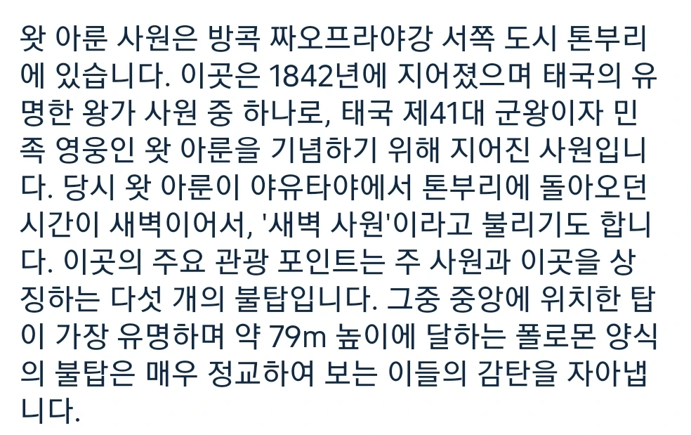 눈앞에 펼쳐진 갖가지 색의 자기와 조개껍질로 입혀진 반짝반짝 빛나는 왓아룬의 아름다움과 위용에 감탄하고, 시간을 돌아 돌아 다시 만난 것에 감사하고, 그 시대의 예술가, 그 당시의 노역자, 왓 아룬을 처음으로 계획하고 설계한 이의 생각을 헤아려 보며 인류의 유산이 지금 나에게 까지 전해져 과거의 시간을 대면하고 있다는 것에 깊은 감동을 받았다.