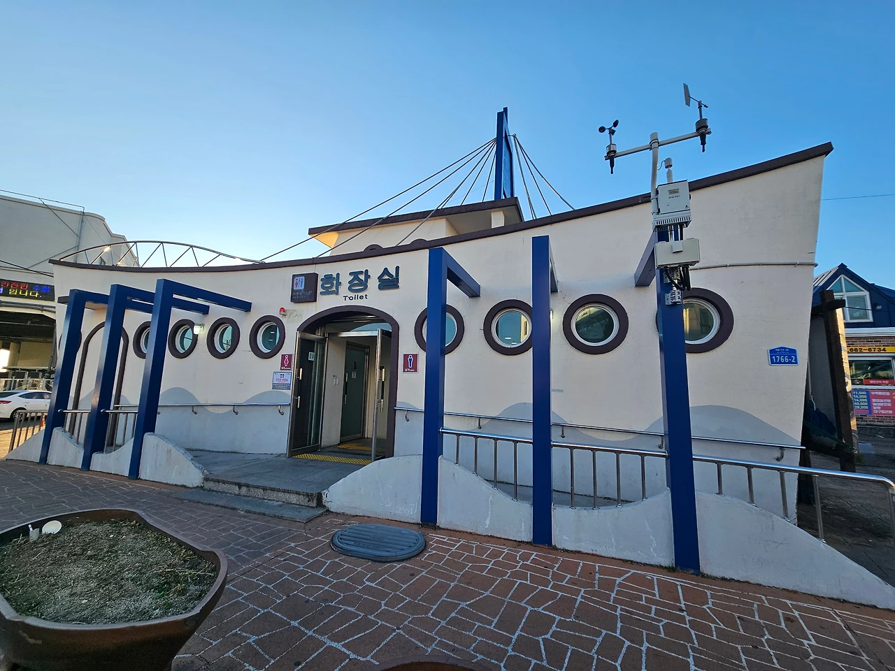 돌아오는 길은 같았지만 올 때는 보지 못한 것들이 눈에 들어왔다. 날도 밝았고, 방향이 달랐으며 보는 내 마음도 달랐을 테니. 햇빛을 받아 회색 테트라포드마저 붉게 보였다. 파란 지붕 위에 갈매기들이 나란히 앉아 있고 시장 근처에 있는 화장실 모양도 배 모양이었다.