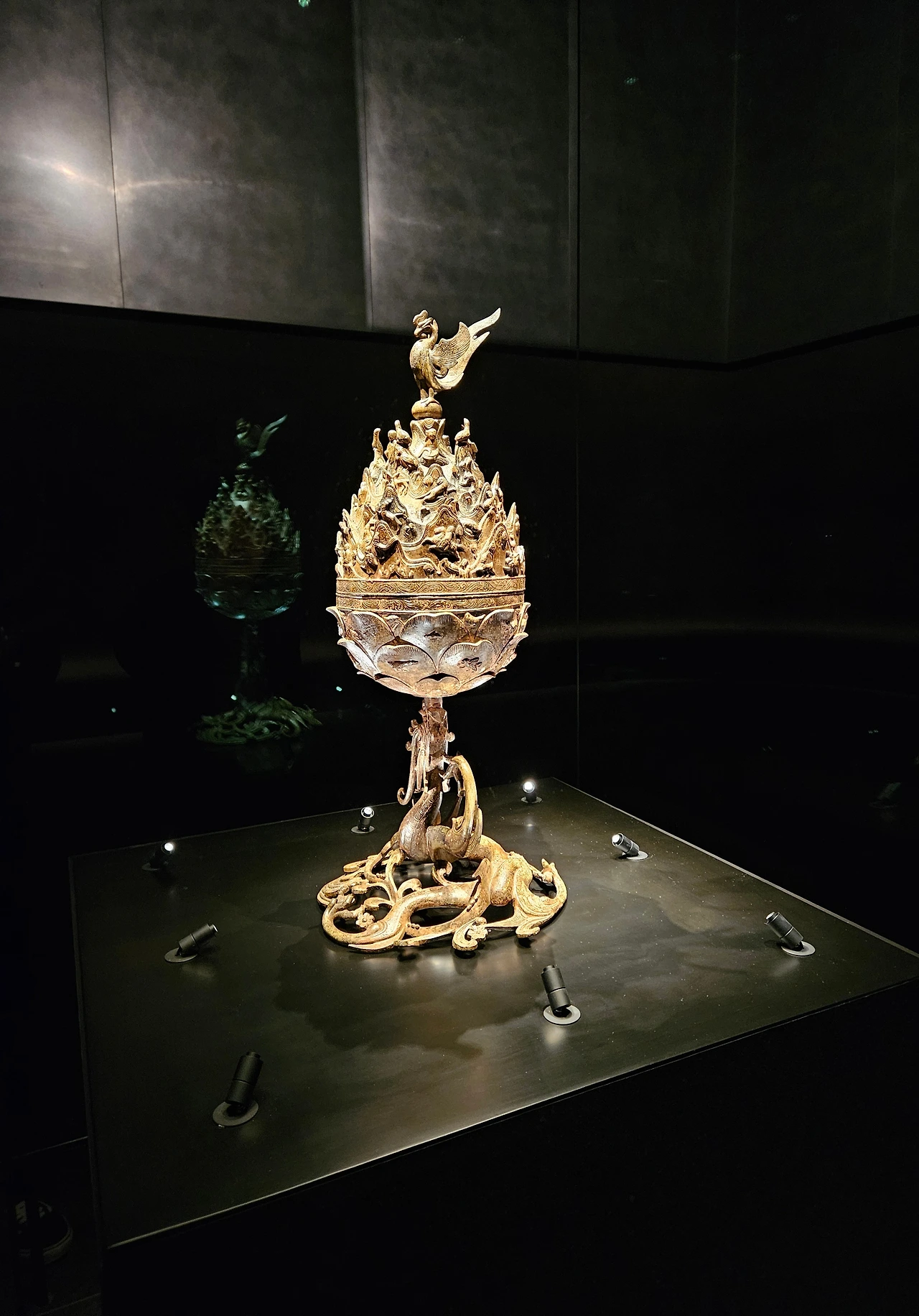 백제 금동대향로를 보러 갈 준비를 마치고 전시실에 들어섰다. 어두운 넓은 방 안에 금동대향로를 향하여 은은한 조명이 비추고 있어 저절로 시선이 옮겨졌다. 중국이나 주변 국가의 향로가 보통 20cm인 것과 비교했을 때 백제 금동대향로는 높이가 약 60cm, 무게는 약 12kg으로 이름처럼 규모가 있는 향로였다. 연꽃 모양과 산봉우리의 모양의 조화, 승천하는 용과 날개를 활짝 펴고 서 있는 봉황의 구도가 훌륭했다. 백제 금속공예의 최고 걸작품답게 금동대향로를 한동안 홀린 듯 쳐다보게 되었다.