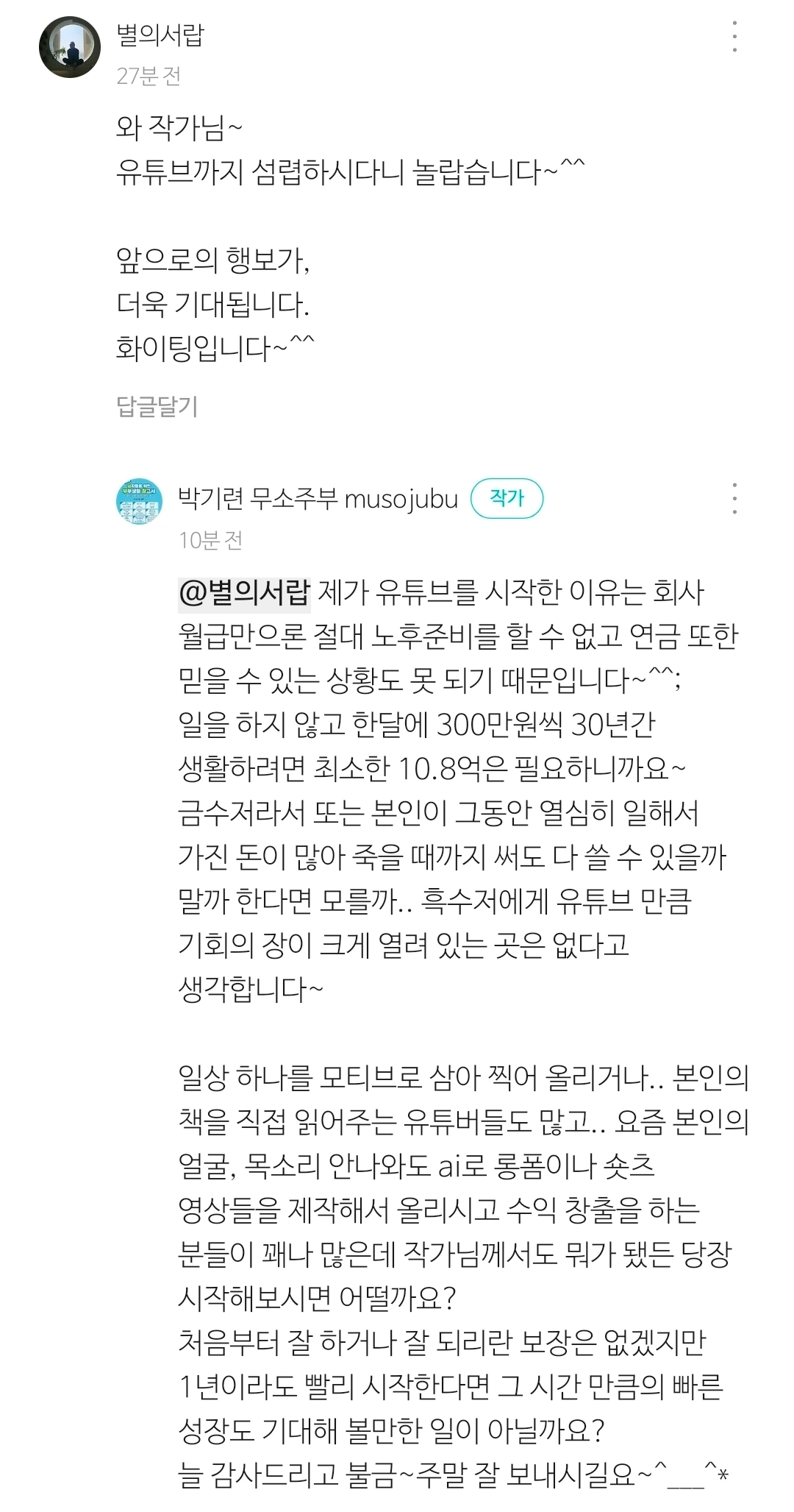 *박기련 무소주부 musojubu 답글 : @별의서랍 제가 유튜브를 시작한 이유는 회사 월급만으론 절대 노후준비를 할 수 없고 연금 또한 믿을 수 있는 상황도 못 되기 때문입니다~^^;