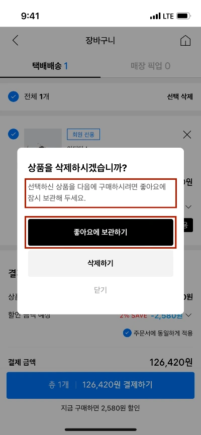 삭제하려는 고객에게 '좋아요에 보관하기'라는 대안을 제공하여, 삭제라는 선택을 철회할 수 있도록 했다.