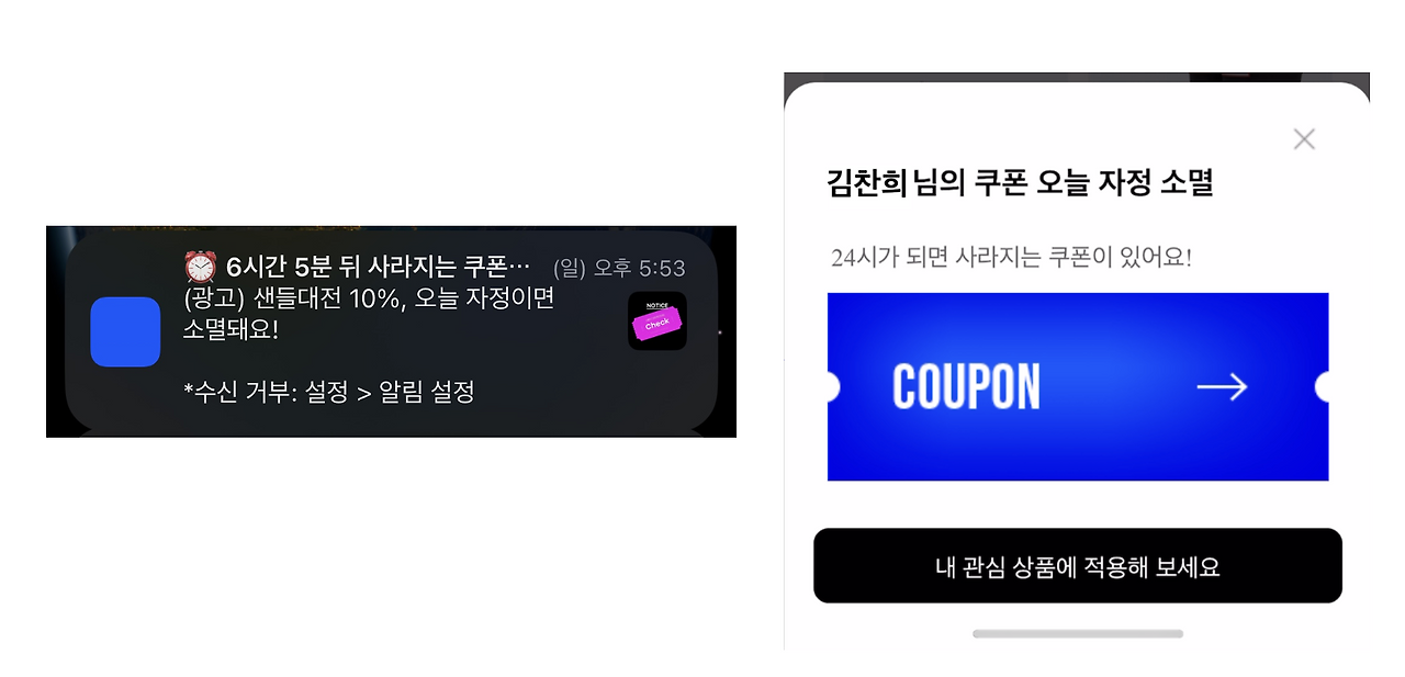 두 메시지의 소구점은 동일하게 '당일 소멸하는 쿠폰 알림'이다. 하지만 발송 채널이 다르기에 도달할 수 있는 고객군은 다르다.