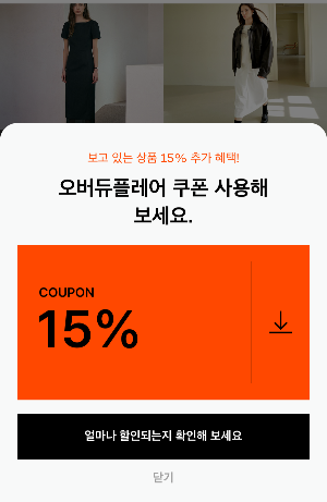 상품 상세페이지에 접속하면 몇 초 뒤 위와 같은 인앱메시지가 뜬다. 방금 '오버듀플레어'라는 브랜드의 상품을 확인했는데, 이 브랜드명이 실시간으로 개인화되어 인앱메시지에 적용된다. 이처럼 유저가 앱을 사용하는 액션에 기반한 높은 수준의 개인화를 제공할 수 있다.