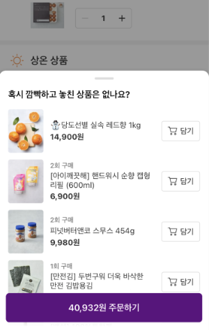 장바구니를 다 담고 나서 '주문하기' 버튼을 클릭하면, 위와 같은 인앱메시지가 노출된다. 구매 의사가 확실해지는 순간 바로 추가 상품을 제안하여 유저의 여정에 쉽게 어우러진다.