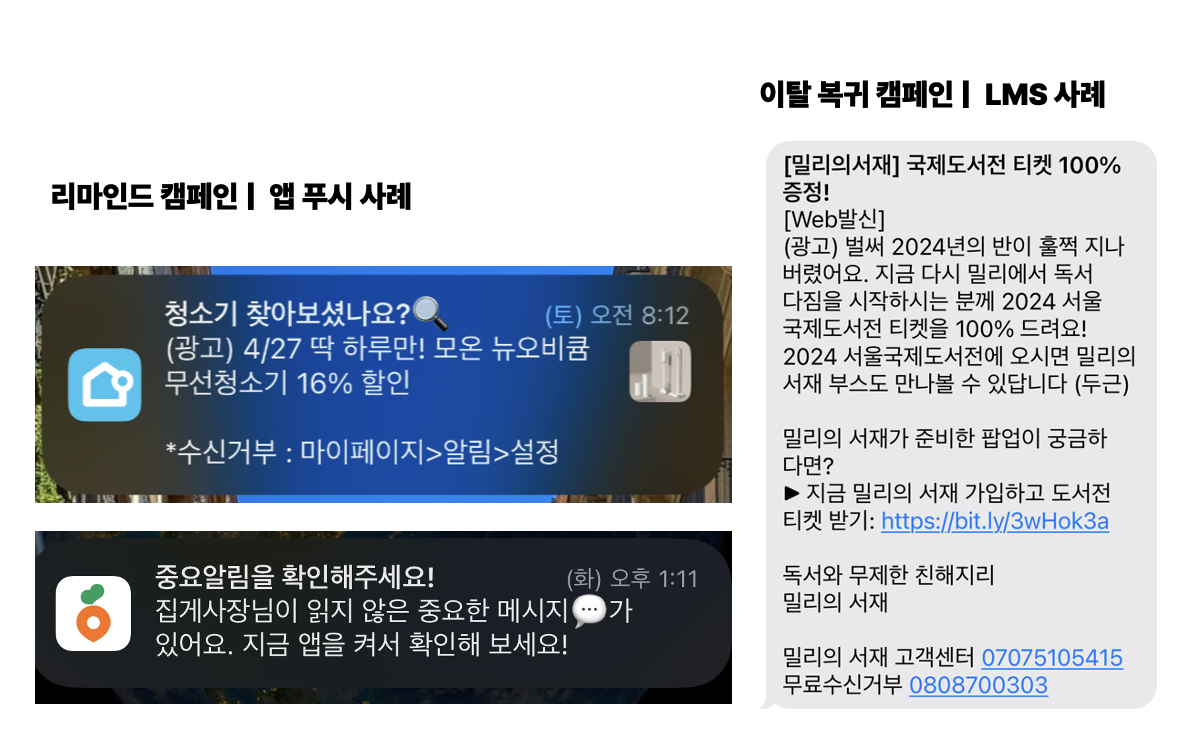 예를 들면, 리마인드나 이탈 유저 복귀 캠페인에서는 주로 앱푸시나 LMS, 친구톡을 활용한다. 유저가 잊고 있는 순간 터치해줘야 하기 때문이다.