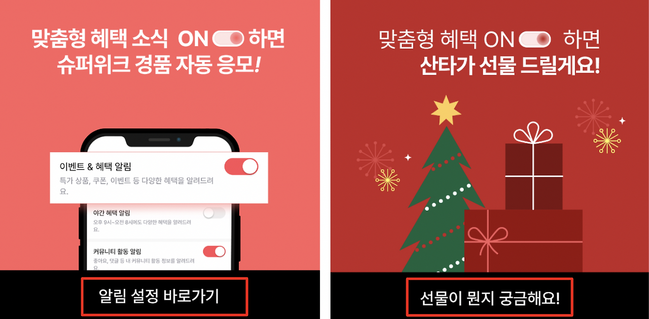 왼쪽은 수신동의를 하는 방법을 알려주고, 오른쪽은 수신 동의 시 받을 수 있는 선물을 언급하고 있다.