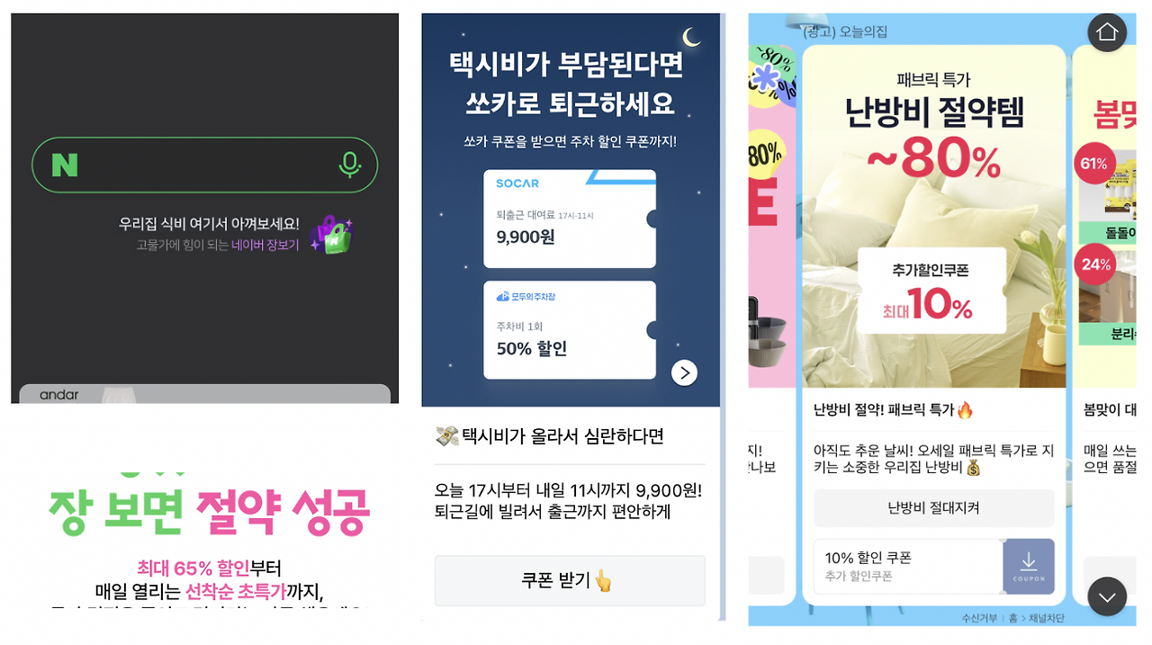 네이버는 '식비 여기서 아껴보세요'는 워딩을 사용해 다른 곳에서 살 경우와 비교해 네이버 장보기가 더 저렴함을 보여준다. 쏘카도 비싼 대체제인 택시비와 비교해 쏘카가 더 저렴함을 보여주고 있다.
