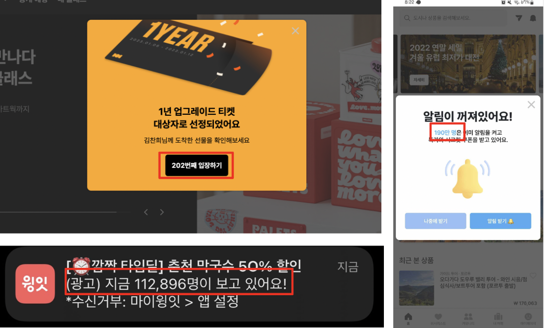 왼쪽 상단 클래스101은 CTA 문구를 '202번째 입장하기'로 써서 마치 오프라인 공간에 들어가는 것처럼 모달을 하나의 진입 관문으로 표현했다. 오른쪽 마이리얼트립은 '마케팅수신동의'라는 다소 심리적 거리감이 드는 워딩을 사용하기보다 '190만명은 이미 알림을 받고 혜택을 받고 있다'는 워딩으로 누르고 싶은 심리를 증폭시켰다.