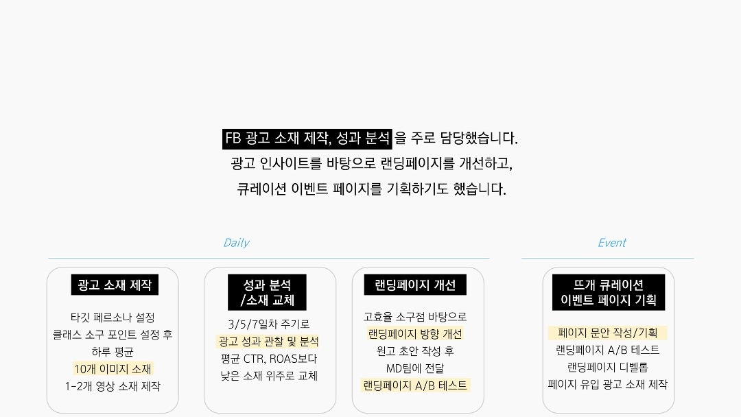 광고소재를 만들고, 잘 되는 소재에서 인사이트를 추출해 랜딩페이지를 개선하는 일을 했다.