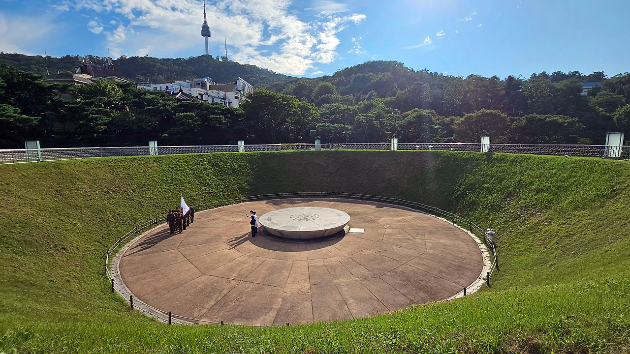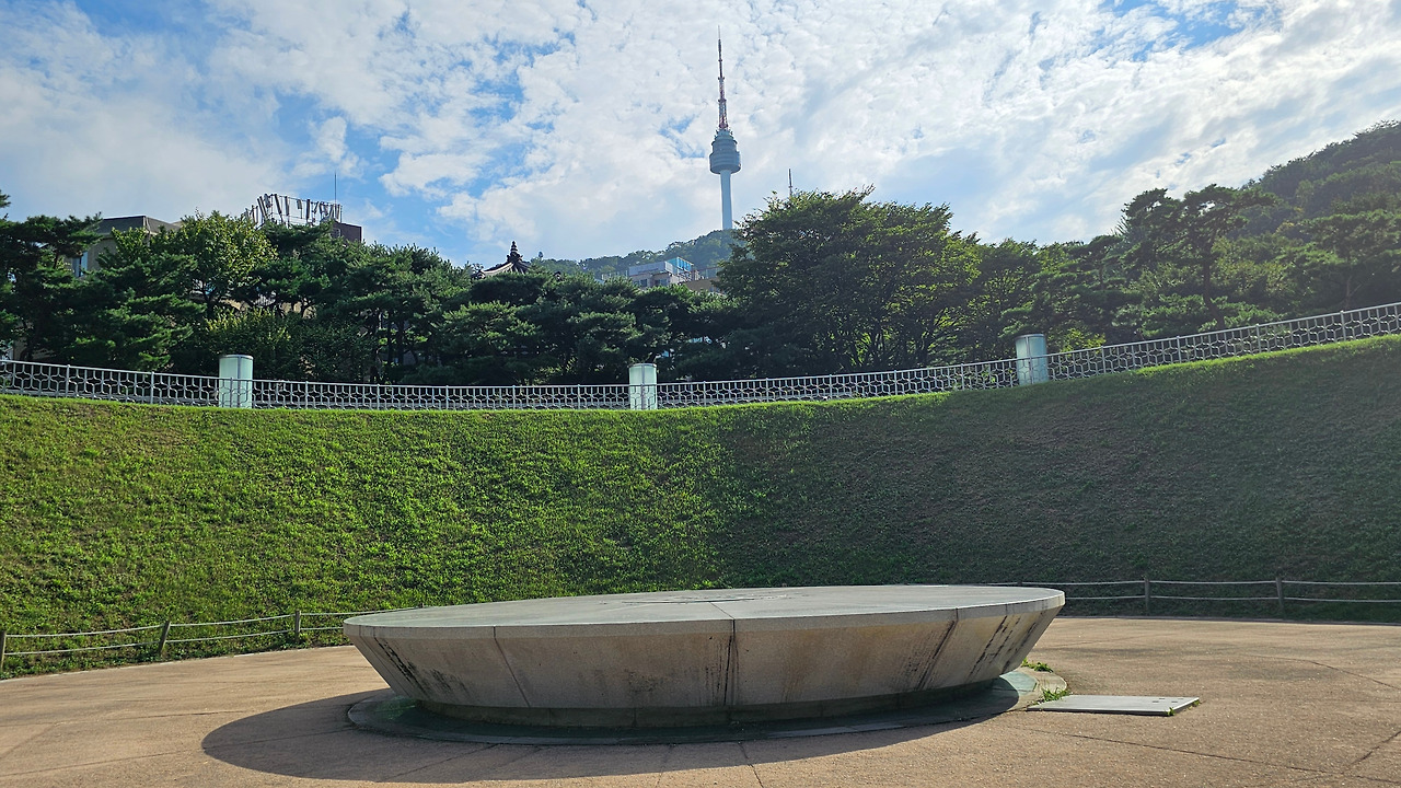 위에서 내려보면 마치 운석으로 크게 파인 분화구 같았다. 가운데에는 화강암 원형 판석이 널찍하게 자리 잡고 있었다. 그 아래에 서울의 모습과 시민들의 생활을 대표하는 문물 600점이 캡슐에 담겨 묻혀 있다.