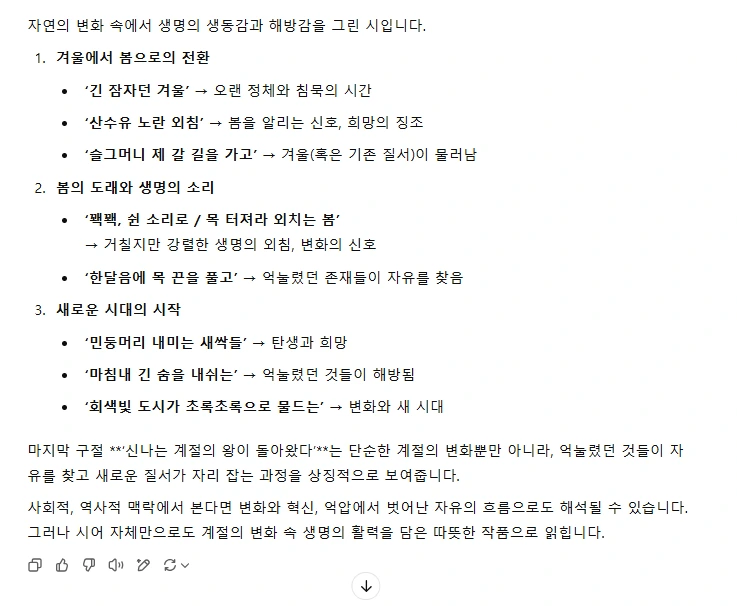 어떤 맥락으로 쓴 글일까요? 시를 쓴 사람만큼은 아니지만 AI가 행간의 의미를 잘 짚어내네요.