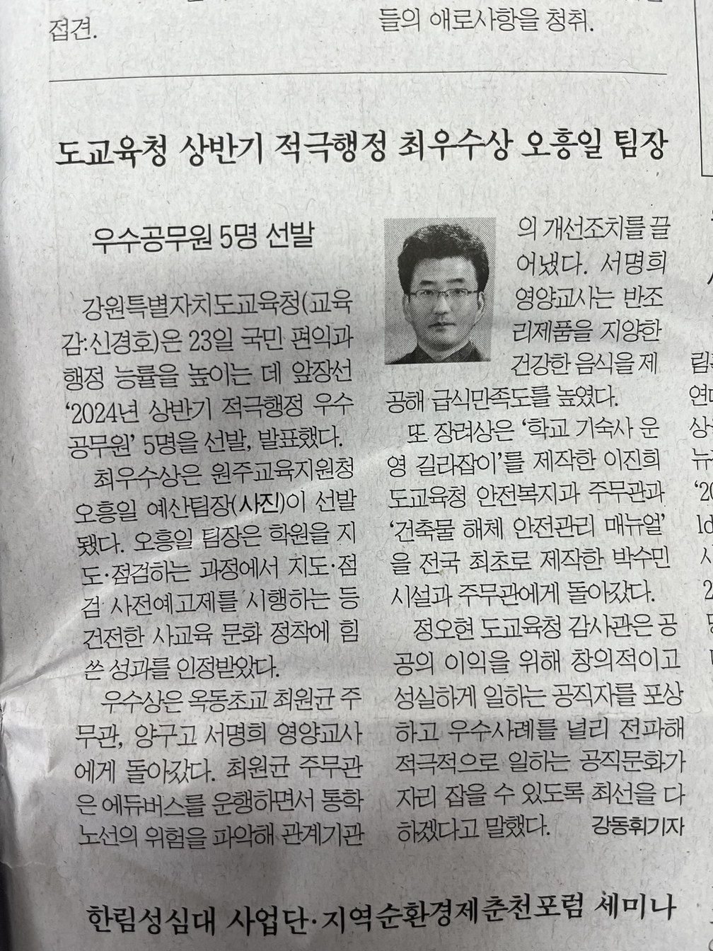 지난해 다양한 민원을 교육수요자와 이해관계자의 입장에서 살피고 해결하는 과정에서 우선적으로 학생들의 권리를 보호하고 교육행정의 투명성을 높이고자 했습니다. 이러한 노력은 강원특별자치도교육청 2024년 상반기 적극행정 최우수 공무원으로 선정되는 성과로 이어졌습니다. 이는 일상 속에서 주변을 생각하는 작은 행동도 확장되면 우리 사회에 긍정적인 영향을 미칠 수 있다는 점을 보여주기도 합니다.