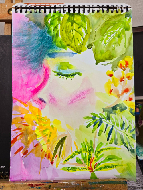 물을 잔뜩 머금은 수채화 붓으로 두세 가지 물감을