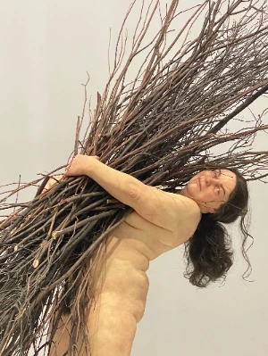 허리가 휠 정도로 보잘것없어 보이는 나뭇가지를 껴안은 여성의 조각.