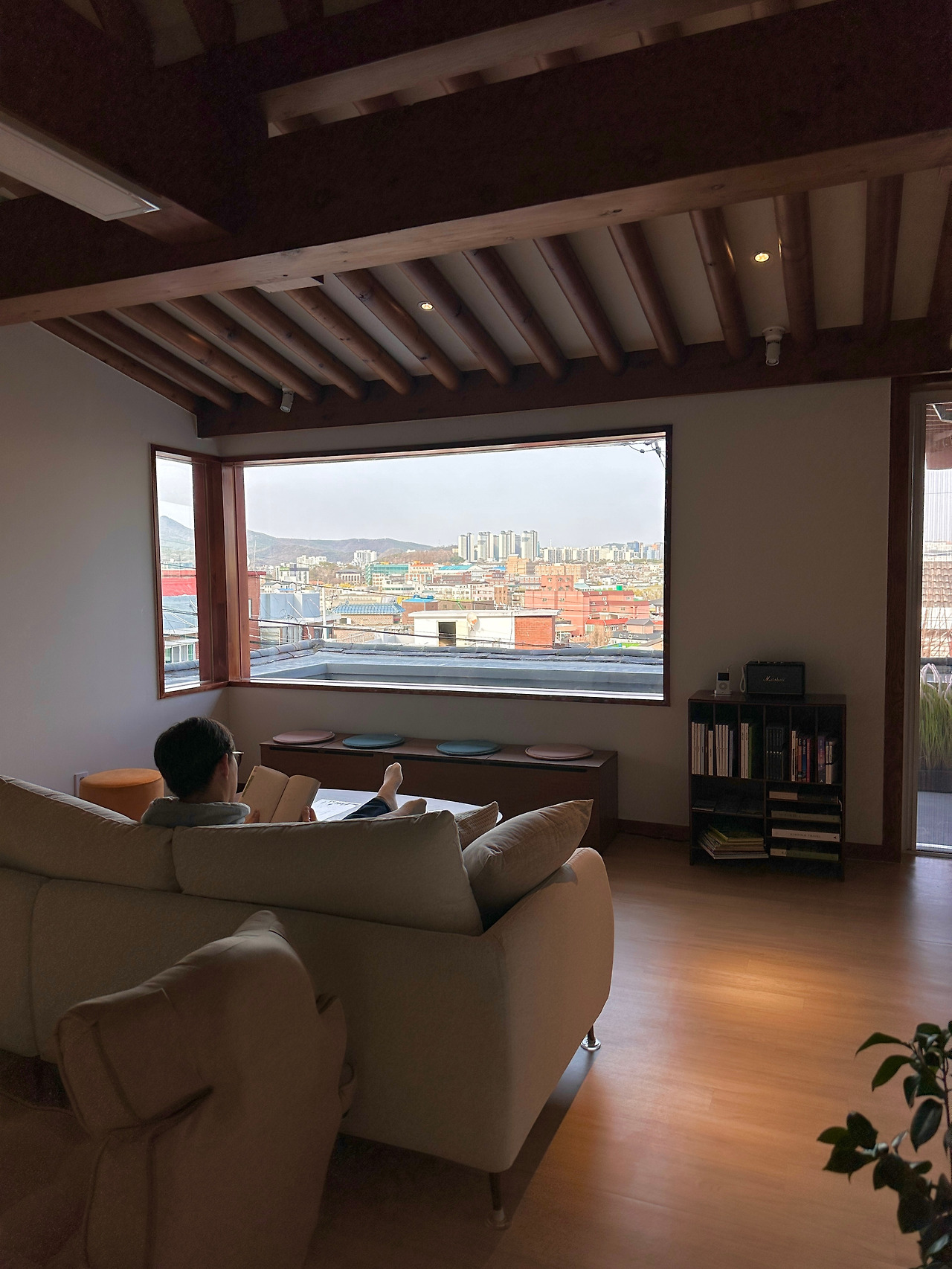 남향으로 뚫린 커다란 통창으로 요란하지 않은 채광이 넉넉히 들어오고 수원 행궁이 내려다 보일 듯 말 듯 수원의 골목과 일대가 한눈에 읽힌다. 심지어 적당히 멀리 열기구가 떠 있는 이국적인 풍경이 눈앞에 펼쳐진다.