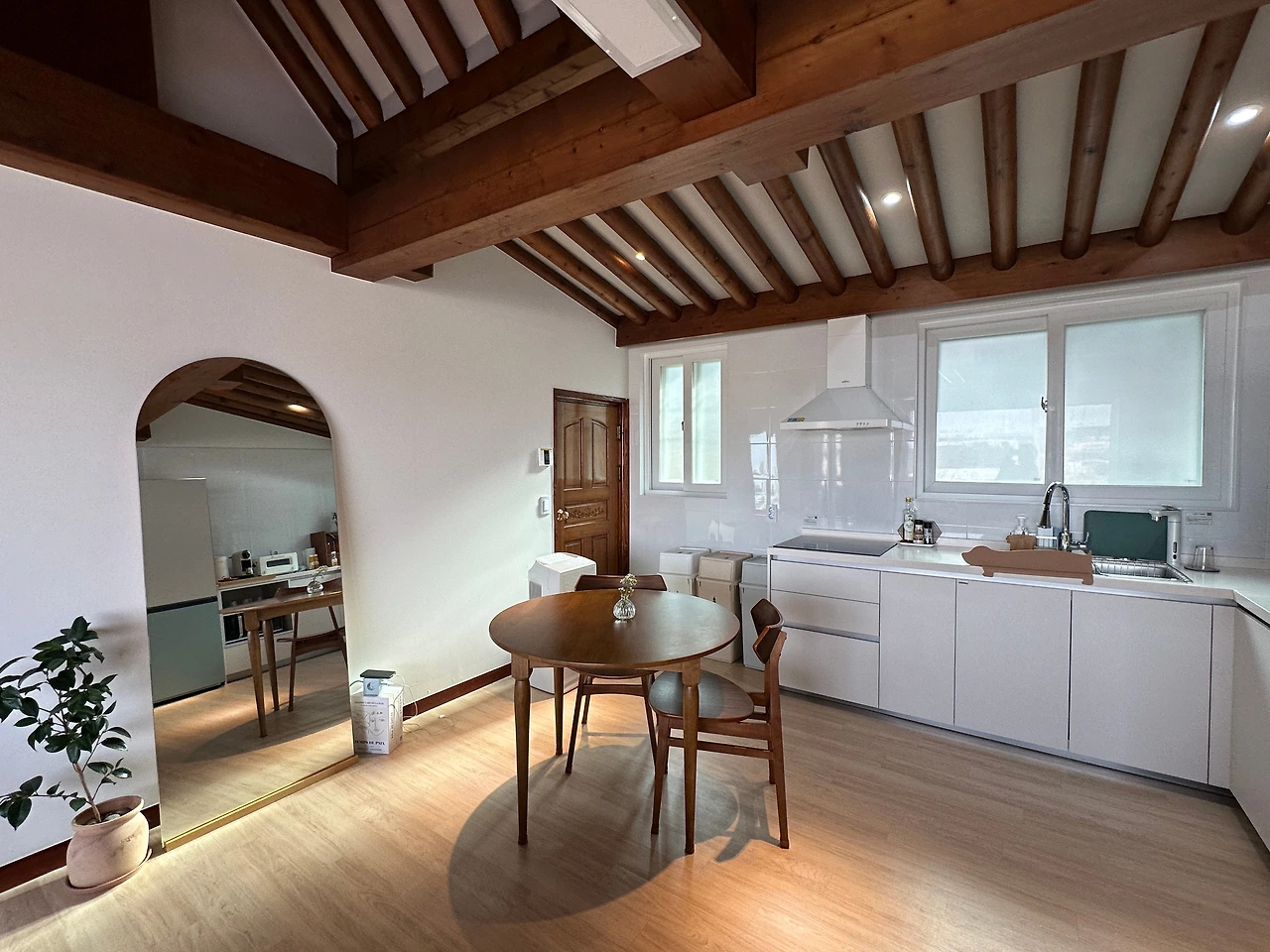 85년도에 만들어진 서까래랑 기왓장을 그대로 노출구조로 두고 모풍이와 시선이 닿는 곳마다 서까래 색과 비슷한 가구들을 배치해서 우리는 이 집에서 편안한 통일감을 느낄 수밖에 없다.