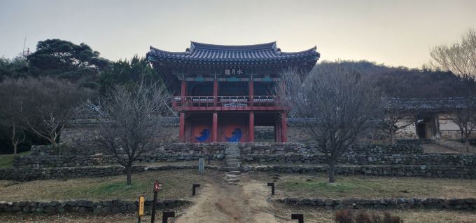 도동서원의 누각인 수월루, 대부분의 서원들이 동입서출(東入西出)을 원칙으로 하는 반면에 도동서원은 이름에서도 알 수 있듯이 동입동출(東入東出)을 원칙으로 하고 있다.