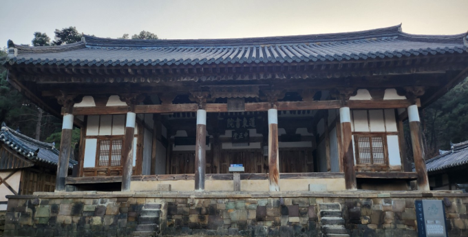 도동서원의 강당인 중정당, 6개의 기둥에 김굉필 선생의 위상을 보여주는 상지가 붙어 있다.