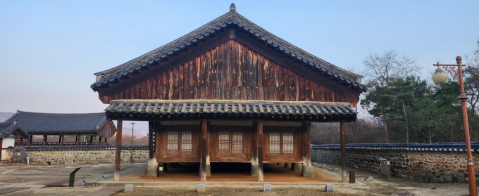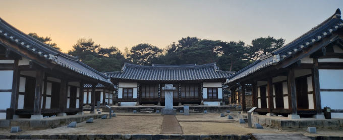 돈암서원의 양성재(중앙)와 좌우의 거경재와 경의재, 강학당인 양성재의 앞마당에 원정비가 위치해 있는 점이 특이하다.